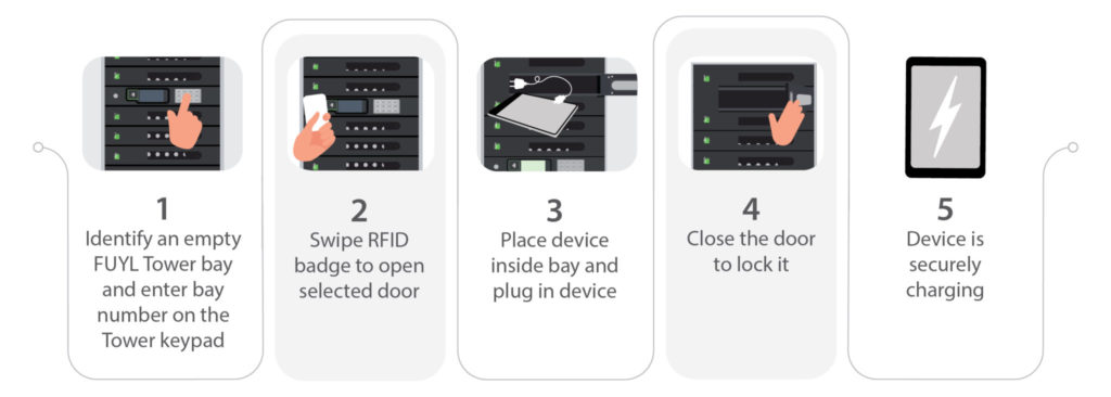 Vauban installed four FUYL Tower 15s in strategic places of passage like the school cafeteria and the hallways. One Tower is designated specifically for teacher use. Here’s how it works: