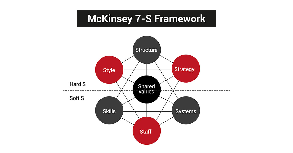 The McKinsey 7-S Framework is a diagnostic tool that highlights how an organisation should carry out change as a system. McKinsey’s framework uses seven interconnected elements to identify misalignments in change implementation: