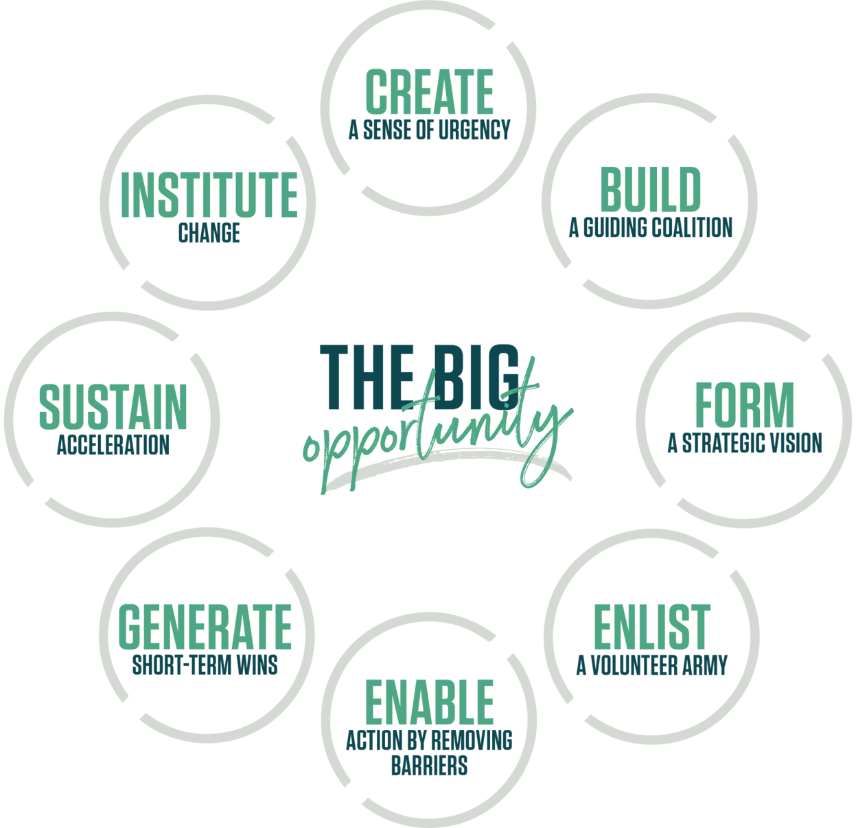 At this stage, your job is to break inertia and create space for change. Communicate the need for action through compelling data and human stories. Then form and introduce your guiding coalition, and share a clear, emotionally resonant vision that answers: