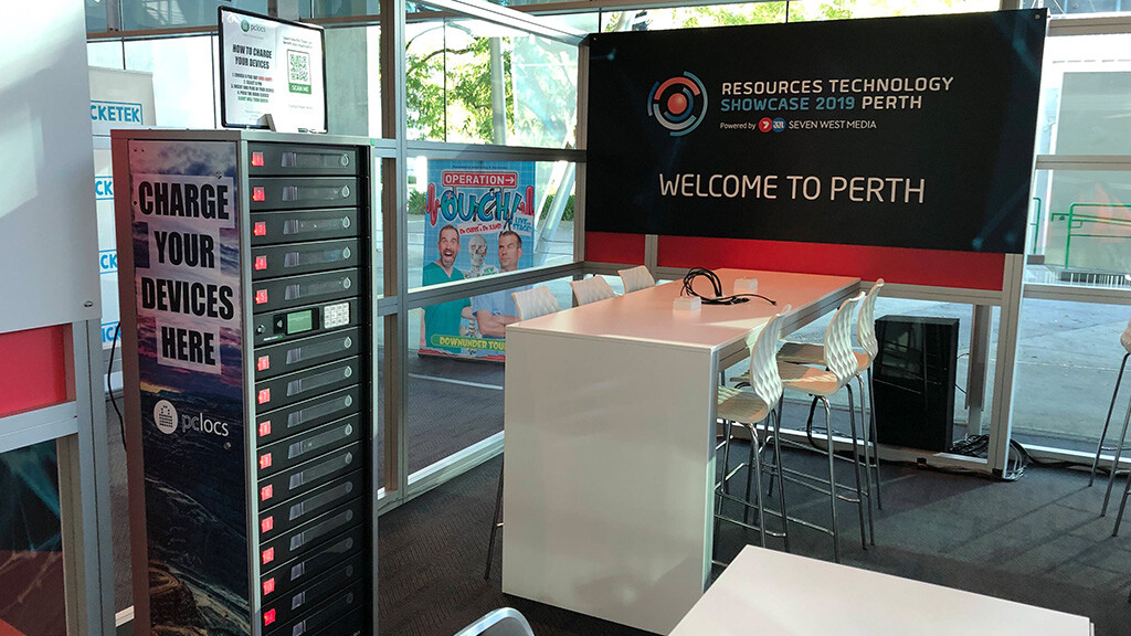 Reacting to this common problem, the team at Seven West Media and Arinex event solutions, the organisers of the hugely successful Resources Technology Showcase 2019, teamed up with PC Locs to come up with an innovative solution. Mobile device charging lockers were deployed at three strategic locations throughout the show: one event charging station on the main exhibition floor for the 6,000 attendees, one in the Seven West Media Hub for journalists and reporters, and one for the keynote speaker sessions allowing the resources sector executives to stay connected.