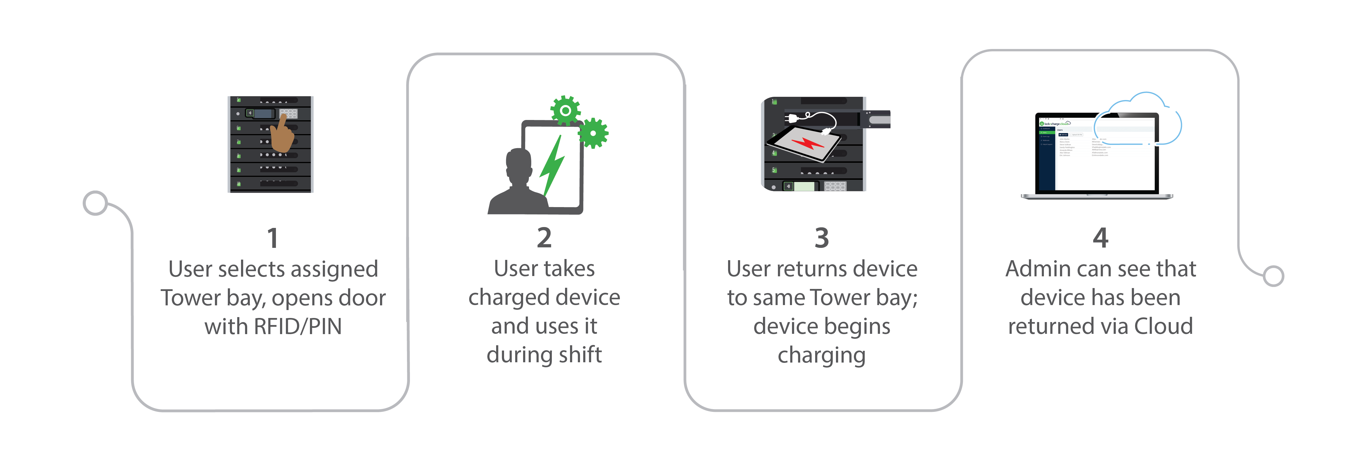 Cloud Admins can remotely control locker access, which has helps in a variety of ways. For instance, when a user is returning a device they didn’t originally check out, the admin can remotely open a locker door on any of the seven FUYL Tower Smart Lockers for them. No walking across the factory floor to meet them, and no significant interruption to their day.