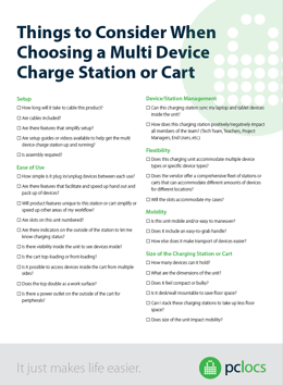 Choosing the right multi device charge station or cart may not seem like a big deal, but seemingly small differences between manufacturers and products could make a huge impact on your mobile device roll-out and your ability to manage devices long term. To help narrow down what benefits and features will best meet your needs, we made a checklist of things to consider when choosing a multi device charge station or cart.